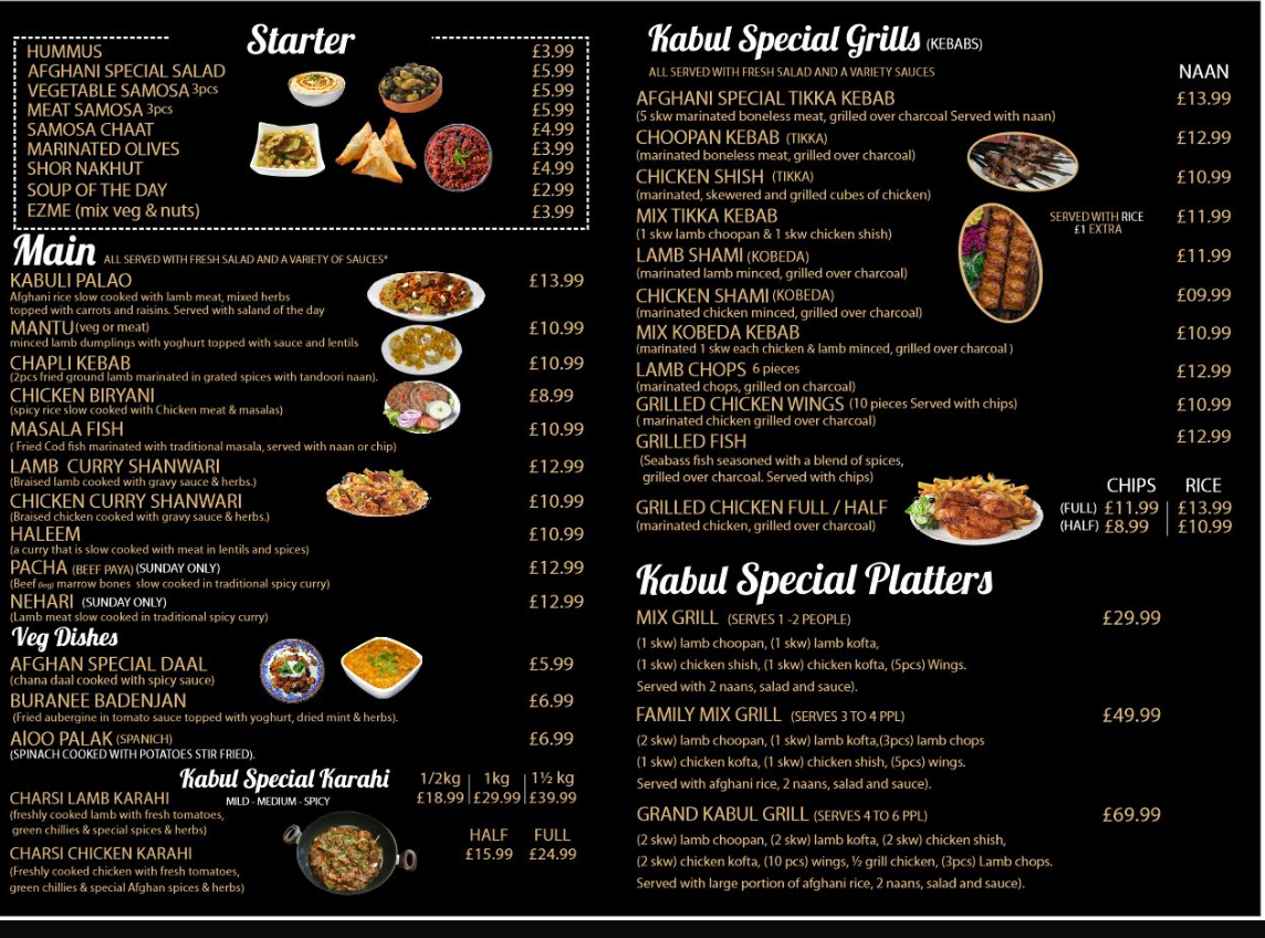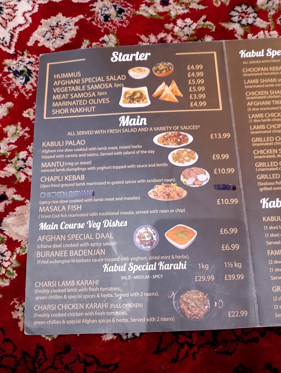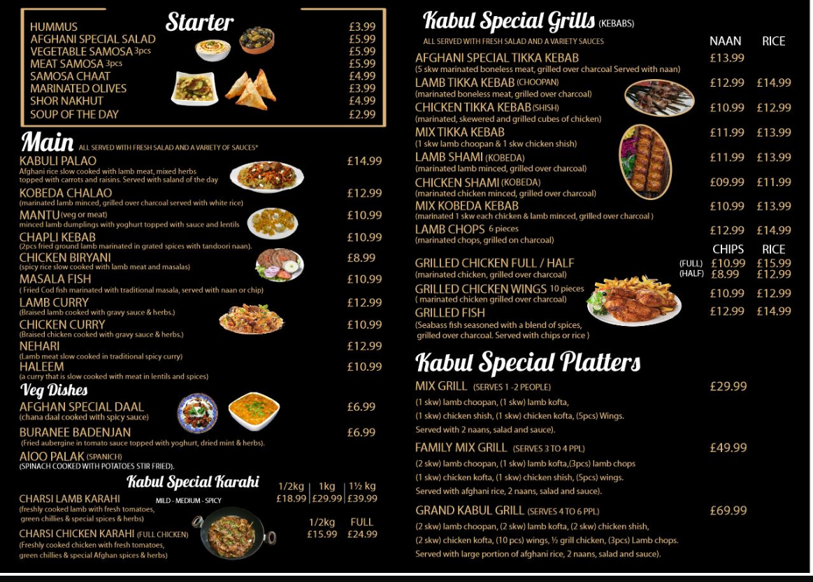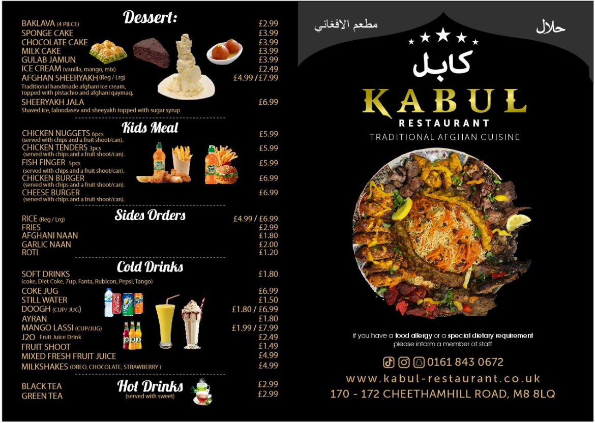 The menu at Kabul Restaurant offers a delightful selection of dishes that showcase the rich flavors of Afghan cuisine. Starting with appetizers, options like Hummus and Afghani Special Salad are perfect for those looking for a light, flavorful beginning. For something heartier, you can try Meat Samosa or the vibrant Samosa Chaat. Moving on to the grills, the Afghani Special Tikka Kebab and Choopan Kebab stand out, offering tender and well-seasoned meats, while the Chicken Shish Mix Tikka Kebab offers a flavorful combination. For main courses, the Kabuli Palao is a fragrant rice dish paired beautifully with lamb or chicken, while Mantu (Afghan dumplings) and Chapli Kebab bring robust and savory flavors. The Chicken Biryani and Masala Fish are popular choices for those seeking a more familiar but delicious option. Vegetarians can enjoy dishes like Afghan Special Daal and Buranee Badenjan, which provide a rich and satisfying experience. The restaurant’s Kabul Special Karahi range, including the Charsi Lamb Karahi and Charsi Chicken Karahi, features dishes cooked in a traditional pot that enhances the depth of flavor. Desserts such as Baklava, Sponge Cake, and Gulab Jamun offer a sweet ending to the meal. Families can enjoy the Mix Grill or Family Mix Grill, while kids will love the selection of meals including Chicken Nuggets and Cheese Burger. Side options like Afghani Naan and Garlic Naan complement any meal, and refreshing drinks like Mango Lassi and Ayran round out the experience. Whether you're craving something light or a full-course feast, Kabul Restaurant offers a menu that caters to a variety of tastes and preferences, making it a standout dining destination.