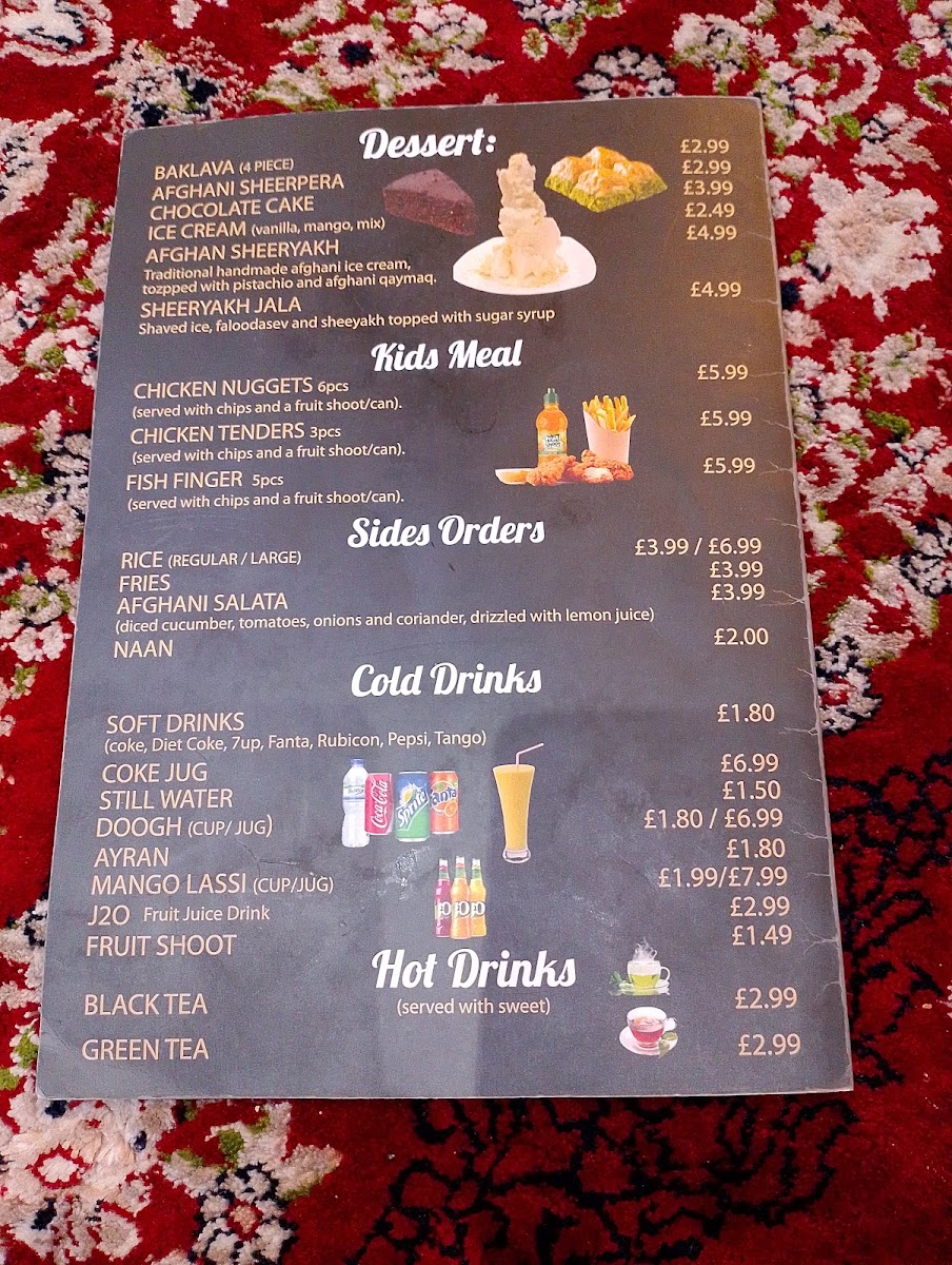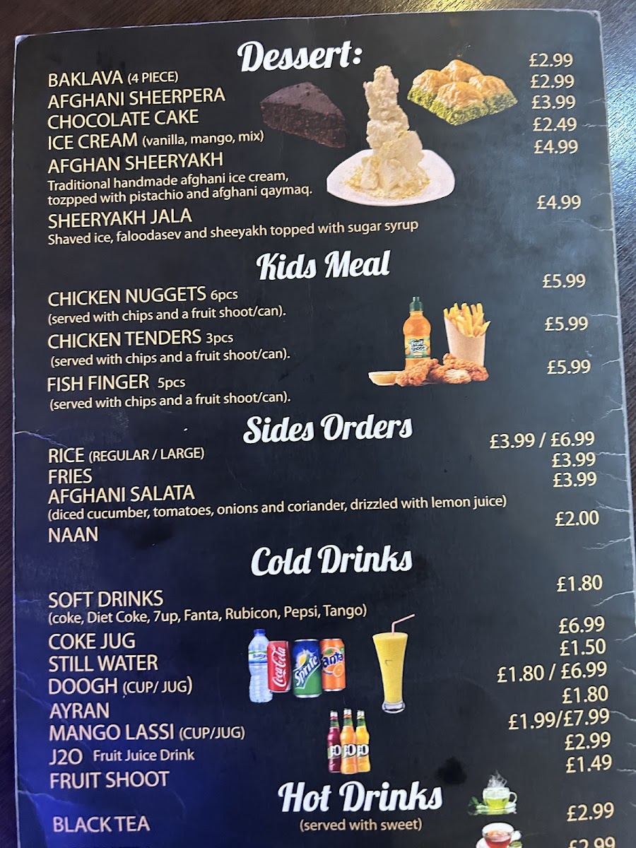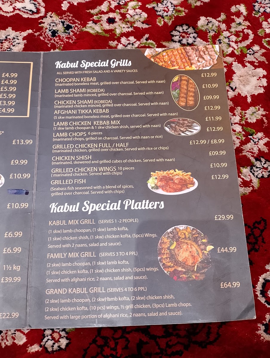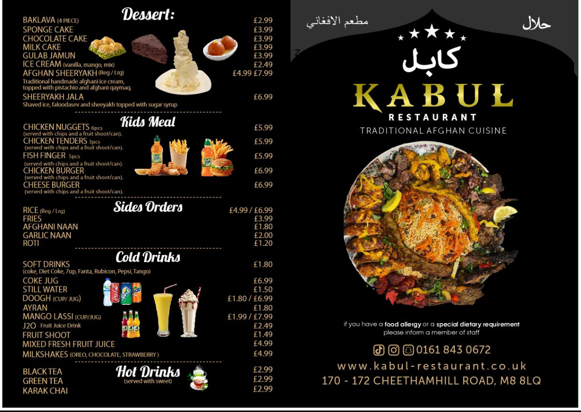 The menu at Kabul Restaurant offers a delightful selection of dishes that showcase the rich flavors of Afghan cuisine. Starting with appetizers, options like Hummus and Afghani Special Salad are perfect for those looking for a light, flavorful beginning. For something heartier, you can try Meat Samosa or the vibrant Samosa Chaat. Moving on to the grills, the Afghani Special Tikka Kebab and Choopan Kebab stand out, offering tender and well-seasoned meats, while the Chicken Shish Mix Tikka Kebab offers a flavorful combination. For main courses, the Kabuli Palao is a fragrant rice dish paired beautifully with lamb or chicken, while Mantu (Afghan dumplings) and Chapli Kebab bring robust and savory flavors. The Chicken Biryani and Masala Fish are popular choices for those seeking a more familiar but delicious option. Vegetarians can enjoy dishes like Afghan Special Daal and Buranee Badenjan, which provide a rich and satisfying experience. The restaurant’s Kabul Special Karahi range, including the Charsi Lamb Karahi and Charsi Chicken Karahi, features dishes cooked in a traditional pot that enhances the depth of flavor. Desserts such as Baklava, Sponge Cake, and Gulab Jamun offer a sweet ending to the meal. Families can enjoy the Mix Grill or Family Mix Grill, while kids will love the selection of meals including Chicken Nuggets and Cheese Burger. Side options like Afghani Naan and Garlic Naan complement any meal, and refreshing drinks like Mango Lassi and Ayran round out the experience. Whether you're craving something light or a full-course feast, Kabul Restaurant offers a menu that caters to a variety of tastes and preferences, making it a standout dining destination.